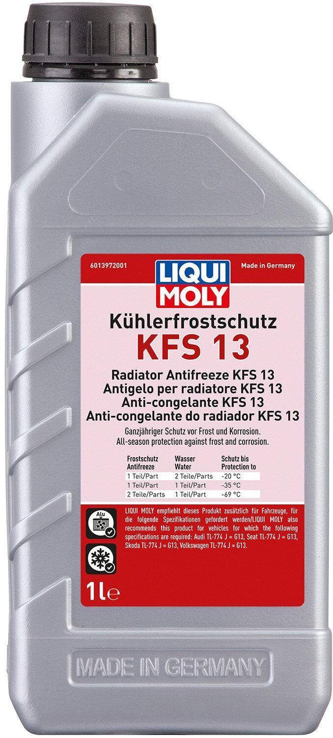 Kuhlerfrostschutz KFS 13-антифриз на основі етилгліколя і гібридних технологій, що відповідає класу G13. Забезпечує відмінний захист від замерзання, іржі, а також від перегрівання. Це концентрат, який при змішуванні з водою забезпечує надійний захист системи охолодження автомобіля при цілорічному його застосуванні. Миттєво блокує виникаючі вогнища корозії.