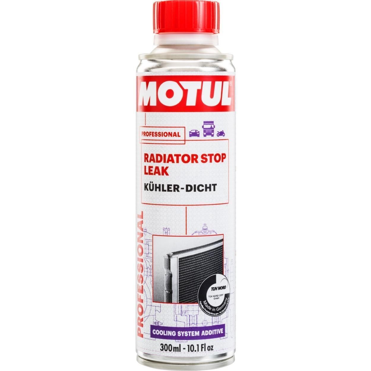 RADIATOR STOP LEAK спеціально розроблено для використання у бензинових двигунах і дизелях, атмосферних або з турбонаддувом, з каталізаторами або без них, в двигунах, працюючих на всіх видах палива. Використовується для герметизації протікань радіатора і теплообмінників, водяних насосів, термостатів, в місцях з'єднання і ушкодження шлангів. Застосовується в всіх типах закритих систем рідинного охолодження легкових автомобілів, комерційної техніки і промислових теплообмінниках. Використовується в цілях ремонту системи і для профілактики. Добавка сумісна з всіма видами охолоджувальних рідин (неорганічними, гібридними, Lobrid & OAT). Добавка забезпечує мастило під час процесу герметизації системи охолодження.