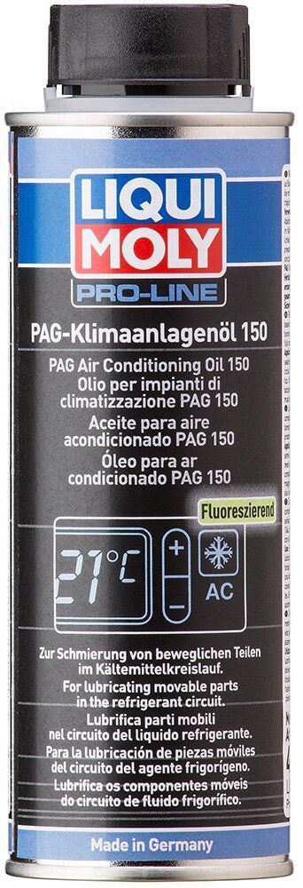 Liqui Moly PAG Klimaanlagenoil 150 - ця повністю синтетична олива на основі поліалкіленгліколю (PAG). Застосовується для мастила, герметизації і охолодження холодильних компресорів або ж контурів холодильного агента в легкових, вантажних автомобілях та інший технике.& nbsp; Liqui Moly PAG Klimaanlagenoil 150 добре змішується з холодагентами типу R 134a і завдяки цій якості чудово підходить для систем з цими охолоджувальними рідинами.