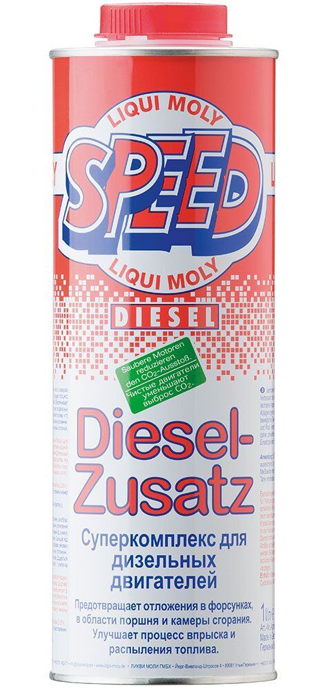 Liqui Moly Speed Diesel Zusatz-комплексна присадка в дизельне паливо, яка є комбінацією м'яких очищаючих, диспергуючих і захисних речовин, розробленою для сучасних дизельних двигунів і задовольняючою всім вимогам, що пред'являються до них. Піднімає цетанове число, м'яко очищає систему живлення, захищає від корозії. Застосування: додається в усі дизельні двигуни легкових і вантажних автомобілів, тракторів, будівельних машин і стаціонарних двигунів. Підходить для тривалої консервації двигуна в екстремальних кліматичних умовах.