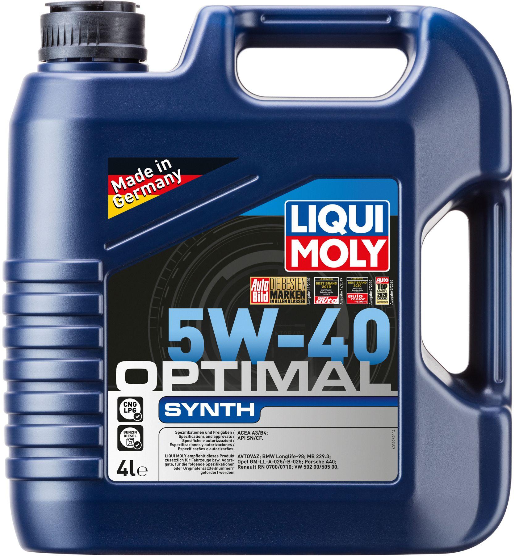 Liqui Moly Optimal Synth SAE 5W-40 – це легкотекуче моторне мастило для використання впродовж усього року. Виготовлено на основі ретельно розробленої суміші синтетичних базових олив і новітніх пакетів присадок. Відповідає високим вимогам, що пред'являються до моторних мастил для найбільш сучасних і потужних бензинових і дизельних двигунів. Чудовий мастильний матеріал, який зводить тертя до мінімуму, а також знижує витрату пального. Продукт протестований на турбодвигунах і каталізаторах.