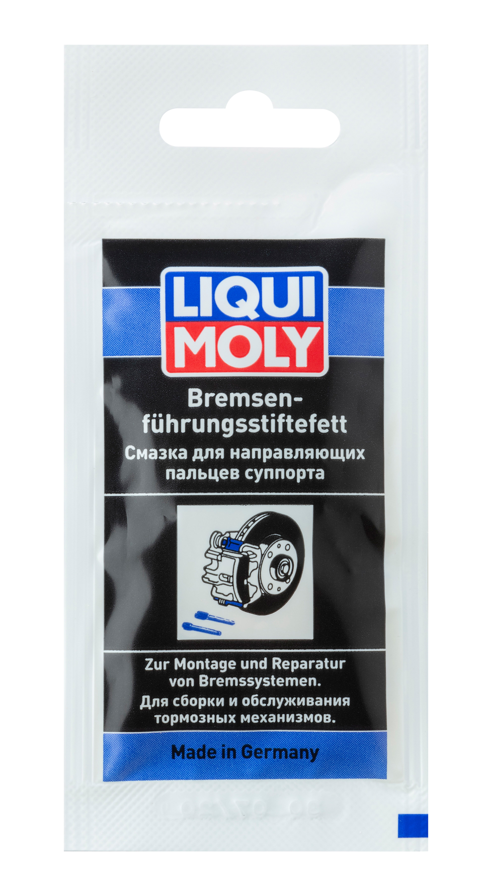 Liqui Moly Bremsenführungsstiftefett – для обслуговування направляючих пальців супортів і їх пильовиків. Запобігає заклинюванню супортів гальмівних механізмів. Стійка до високих температур (до 250 °С). Покращує надійність роботи гальмівної системи в цілому.