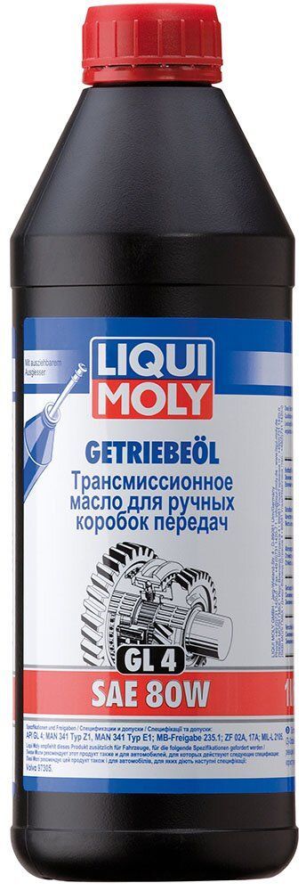 Liqui Moly Getriebeoil SAE 80W (GL4) – мінеральна трансмісійна олива, призначена для механічних коробок передач і редукторів, де рекомендовано застосування мастильного матеріалу класу API GL-4. Універсально застосовно для всіх типів циліндричних, конічних, черв'ячних передач. Має відмінні властивості протизносу, антикорозійних, стійко до старіння. Сумісно з ущільненнями і сальниками.